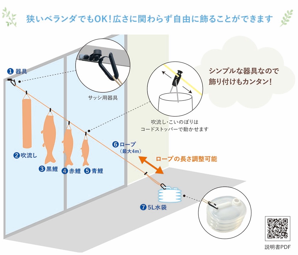 広いお庭がなくても、ベランダなどの狭いスペースに鯉のぼりを飾る事ができる『まどデコセット』。より身近に鯉のぼりを楽しむことが出来ます♪