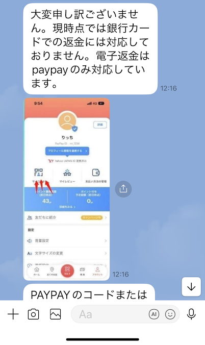 注文し支払いを済ませると、LINE経由で「欠品なのでキャンセルとし返金します」と一方的にキャンセル扱いとなり、その際に「PayPayのみ対応しているので、PayPayのコードまたはリンクしてください」求めてきます。