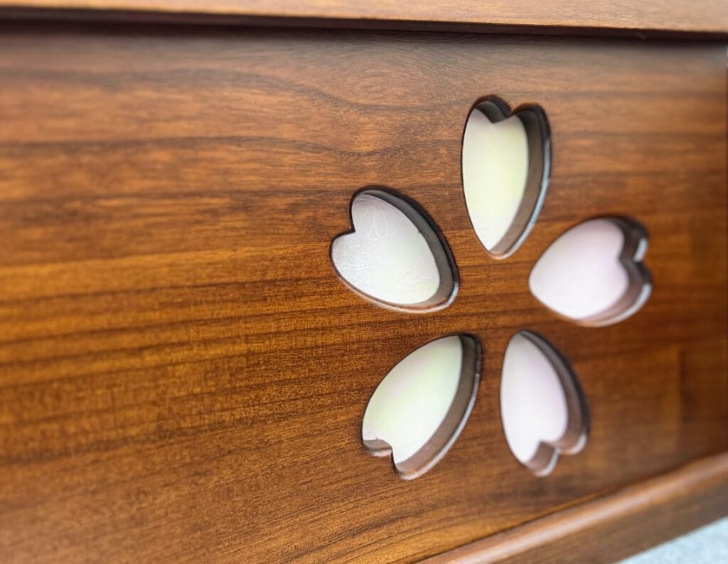 収納箱の前面にも桜の花が彫られ、ブラウンの木目調が見た目にも重たくなり過ぎず、どことなく可愛らしさも兼ね備えた仕上げとなっております。