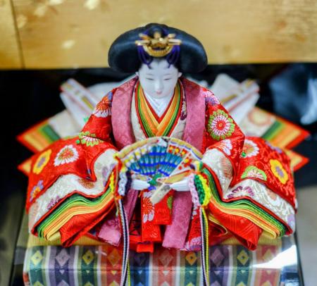 こちらのお雛様は有職のお雛様で、女雛は昔ながらの赤いお着物で、流行に左右されることはありません。