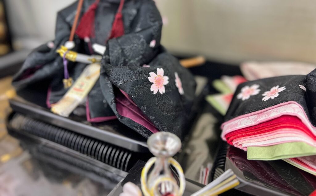 姫のお袖にも同じように手描きの桜が描かれ、二人がお揃いになる様にと。
