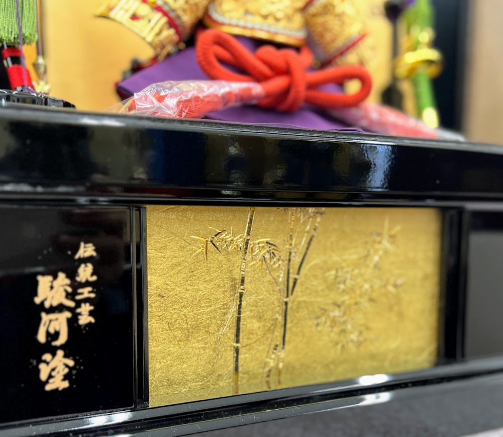 収納箱兼飾り台は、伝統工芸の駿河塗でシンプルですが美しく深みのある黒塗とし、面取りや木材の重ね具合等でピシッと緊張感と重みを持たせ、正面の前板には美しい箔で竹の柄を配しました。