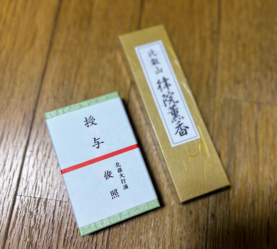 一時間ほどでお護摩も終わり、別室で北嶺大行満 叡南俊照大阿闍梨様にご挨拶させていただくのですが、名前を言い、少しお話しもせていただいて、写真の「律院薫香」というお線香と「念珠」をいただきます。