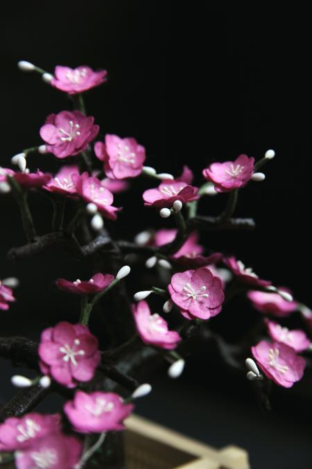 お花には、昔から高級繭玉紅梅白梅を使用しておりますが、これは繭玉を開き花の形で型抜きし、紅と白に染めて重ねて作るという大変手間の掛かる格調高い手づくりの紅梅白梅となります。