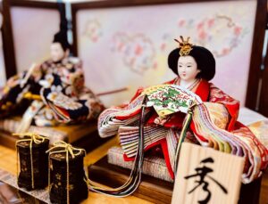秀月の男雛・女雛共に昔から綺麗なお顔とご評判いただいており、お召し物も上質な素材や柄を厳選し仕上げ着せ付けてありますので、押しの強いお飾りとは異なり品良く佇む様にと仕上げられております。