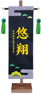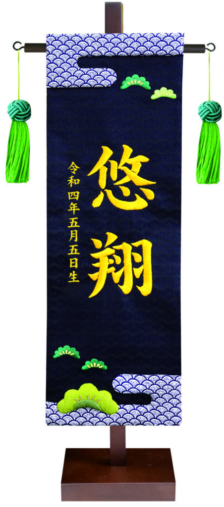 こちらの高級押絵刺繍名前旗飾り 松風は、押絵と刺繍の2技法を施した豪華な仕立てとなっており、柄は慶事の象徴とされる青海波と松をあしらった縁起の良い絵柄。