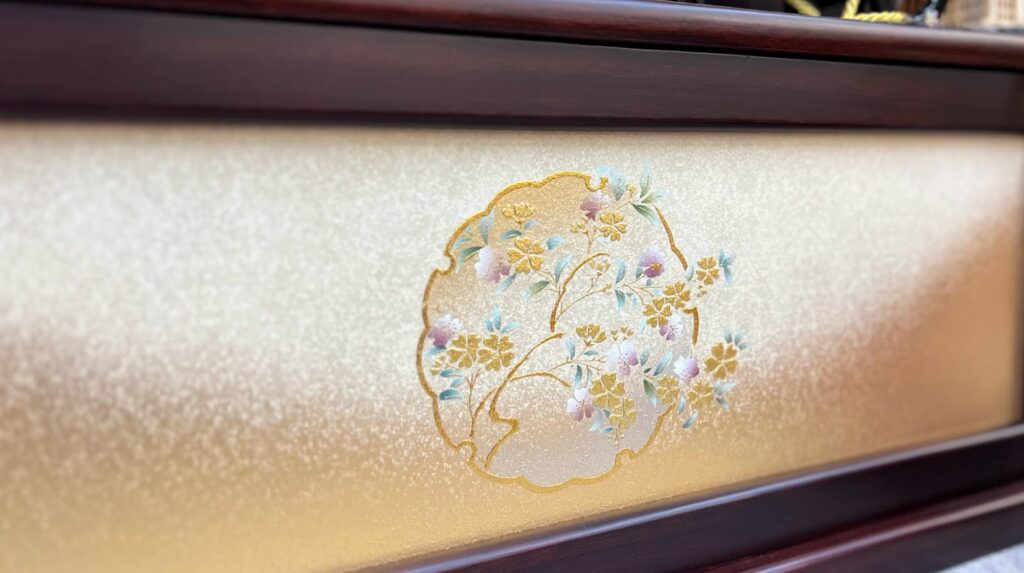 ここに、あまりごちゃごちゃと派手な絵が描かれていたりすると、一瞬見た目は華やかに感じるかもしれませんが、目線も下がる為にお人形よりも絵の方が目立ってしまい、肝心な人形への注目度が二の次になってしまいます。