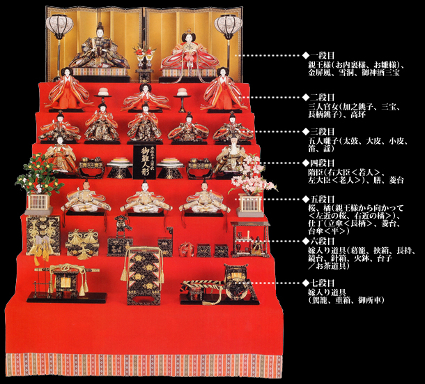 | 一段目 | 親王様(お内裏様、お雛様)、金屏風、雪洞、御神酒三宝 |
