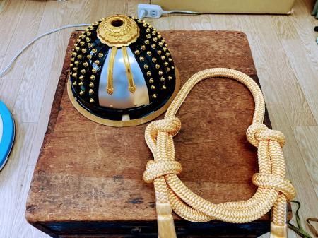 鍬形(くわがた)を差す台輪(だいわ)という金具の取り付け位置の確認をしているところで、この台輪という金具はあえて更に分厚い素材を使用し、華やかに牡丹柄用いて重量感を感じさせる様にし、兜として最も目立たせる部分ですので迫力と美しさが大事になってきます。