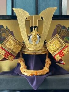 両方の吹き返し等には金の蝶と牡丹の飾金具で装飾し、鍬形は伝統的な形で中心には木彫金箔押龍頭はお決まりです。