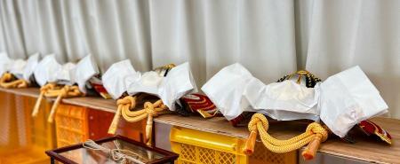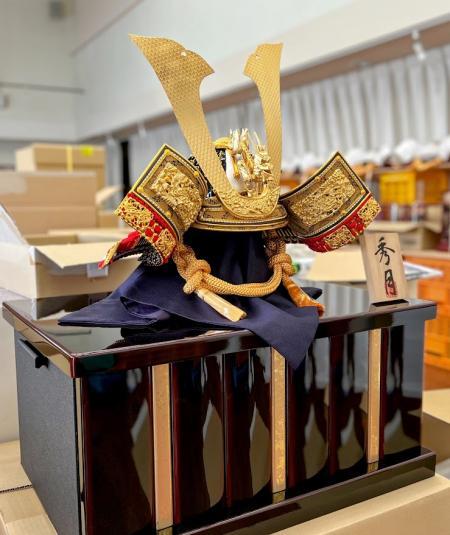 以前は着用兜用の兜櫃を制作し使用していたのですが、やはりこのご時世で制作が困難になってしまった為に、急遽別の櫃の代わりとなる収納箱をご用意させていただきました。